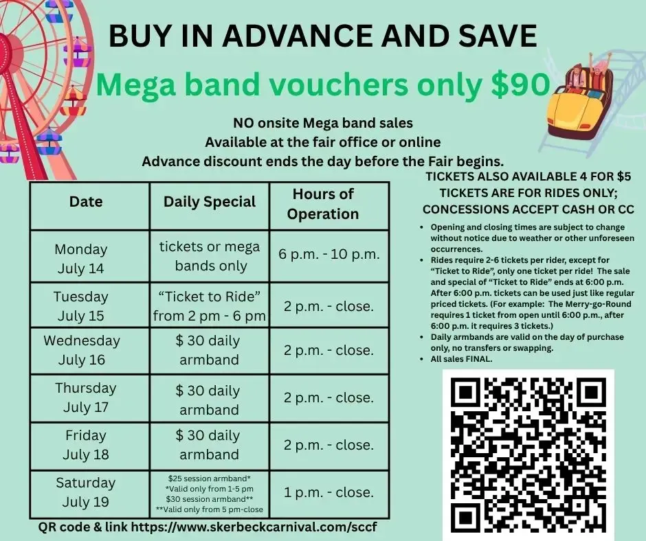 Carnival Mega Passes can be purchased online at the Skerbeck Family Carnival link below or on ShoWorks under the "Fair Entry" icon throughout the website. Mega Passes can also be purchased at the 4-H Office in Port Huron, office hours listed on the website under "Home". Mega Passes can also be purchased at Goodells County Park.